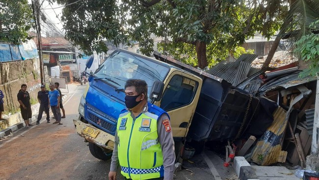 Dilihat di Twitter TMC Polda Metro Jaya, Jumat (28/7/2023), truk fuso itu terperosok di jalanan turunan pukul 08.50 WIB. Truk tersebut terlihat mundur dan menabrak bangunan di dekat turunan tersebut.