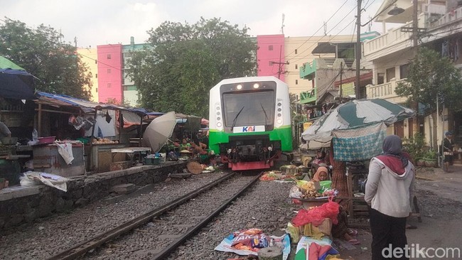 Para pedagang dan pembeli yang sudah hafal betul dengan situasi itu dengan sigap mengangkut beberapa barang dagangan yang berada di lintasan kereta, termasuk payung yang biasanya ditancapkan di tepi pelintasan KA.