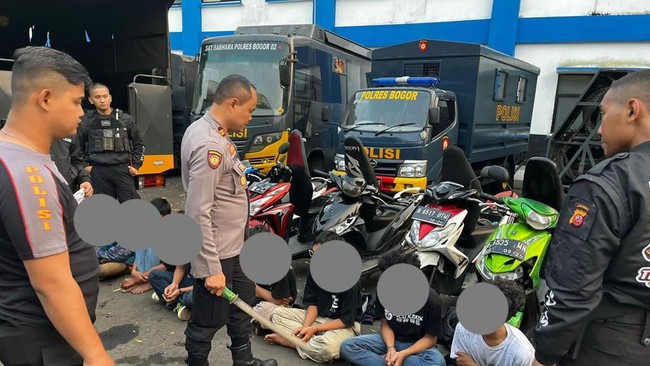 Tujuh orang diduga anggota gangster yang diamankan, kemudian dibawa ke Mako Polres Bogor Jl Tegar Beriman, Cibinong, Kabupaten Bogor.