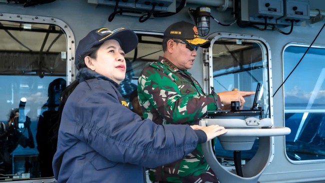 Puan beserta rombongan menyaksikan latihan perang TNI didampingi Panglima TNI Laksamana Yudo Margono, KSAD Jenderal Dudung Abdurachman, KSAL Laksamana Muhammad Ali dan KSAU Marsekal Fadjar Prasetyo, serta jajaran petinggi TNI lainnya.