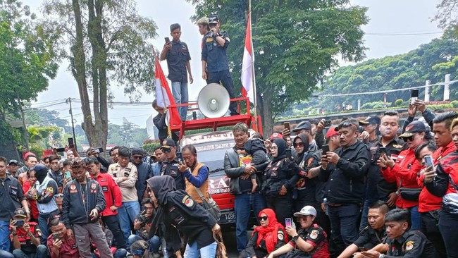 Demonstrasi oleh massa Manggala Garuda Putih itu dilakukan di Bandung, Rabu (2/8/2023). Massa tampak melakukan aksi teatrikal untuk mengungkapkan kekecewaannya terhadap Rocky Gerung.