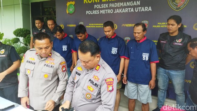 Keempat tersangka tersebut dihadirkan dalam jumpa pers, di Polsek Pademangan, Jakarta Utara. Keempat tersangka berbaju tahanan dan diborgol.