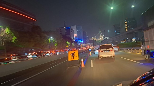 Seorang warga bernama Lia melaporkan kemacetan terjadi menjelang Km 1+800 pukul 23.00 WIB. Perbaikan jalan terjadi di jalur satu atau kiri arah Cawang.