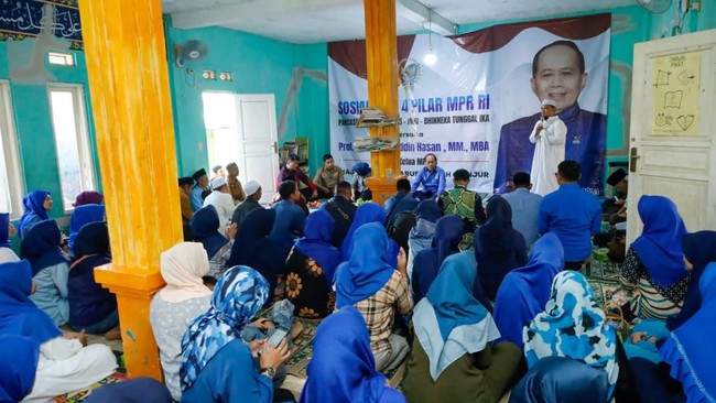 Wakil Ketua MPR Syarief Hasan menggelar Sosialisasi Empat Pilar MPR di Aula Pondok Pesantren Darussa'adah, pada Jumat (4/8). Lebih dari 200 orang warga Kampung Cibungur, Desa Peuteuycondong, Kecamatan Cibeber, Kabupaten Cianjur, Jawa Barat menghadiri kegiatan ini.