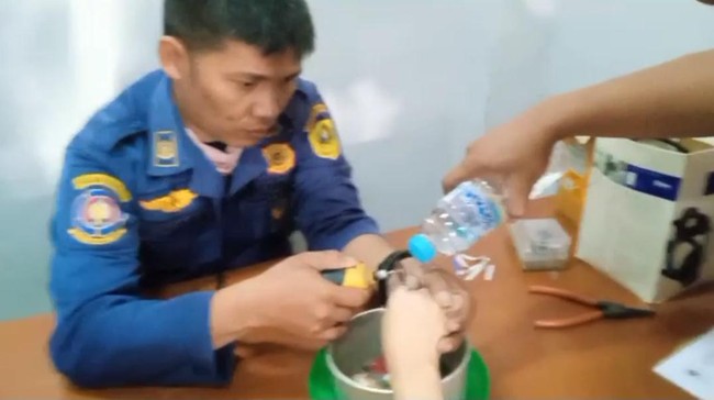 Dalam video yang dibagikan, tampak petugas menggunakan gerinda kecil untuk memotong cincin pada jari wanita tersebut. Air disiramkan untuk melancarkan proses pemotongan cincin.