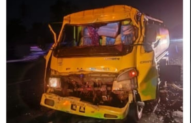 Dalam foto yang dibagikan, terlihat truk tangki air ringsek pada bagian depan. Air juga tampak berceceran di jalanan.
