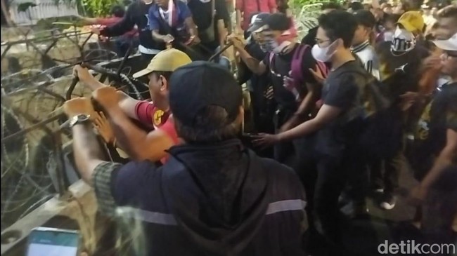 Massa juga menggoyang-goyang barier beton. Massa mencoba merobohkan barikade tersebut.