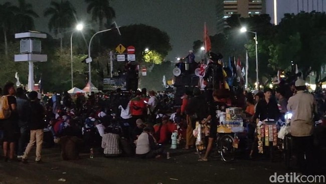 Massa buruh memilih terus bertahan di kawasan Patung Kuda, Jakarta Pusat (Jakpus), hingga malam ini. Mereka duduk dan berkumpul sambil mendengarkan orasi dari mobil komando.