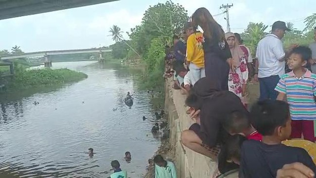 Dilansir detikSumbagsel, tampak puluhan warga berbondong-bondong terjun ke sungai di desa tersebut mencari benda antik yang diduga harta karun.