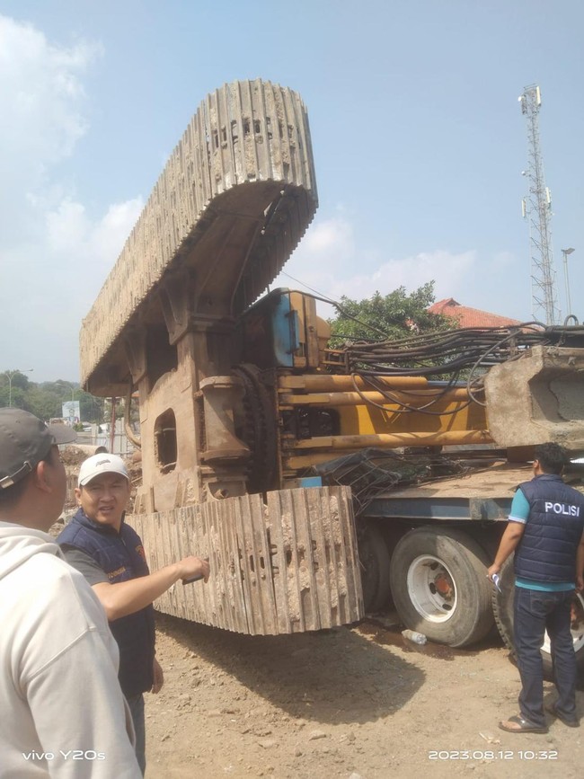 "Kronologi kejadiannya, pada saat kendaraan crane mau menaikkan besi forklift ke kendaraan trailer, kendaraan crane tersebut miring dikarenakan permukaan tanah yang miring sehingga kendaraan crane tersebut jatuh ke ujung kendaraan trailer tersebut," kata Kasat Reskrim Polres Cilegon AKP David Adhi Kusuma dikonfirmasi wartawan, Sabtu (12/8/2023).