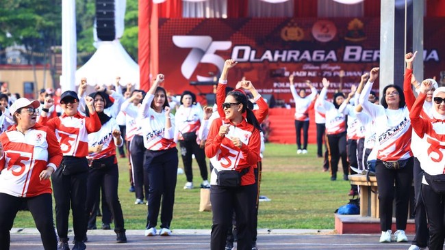 Olahraga bersama dalam rangka memperingati hari jadi ke-75 Polisi Wanita (Polwan) RI tahun 2023 digelar di Lapangan Bhayangkara, Jakarta Selatan hari ini. Acara ini dihadiri istri Kapolri Jenderal Listyo Sigit Prabowo dan istri Panglima TNI Laksamana Yudo Margono.