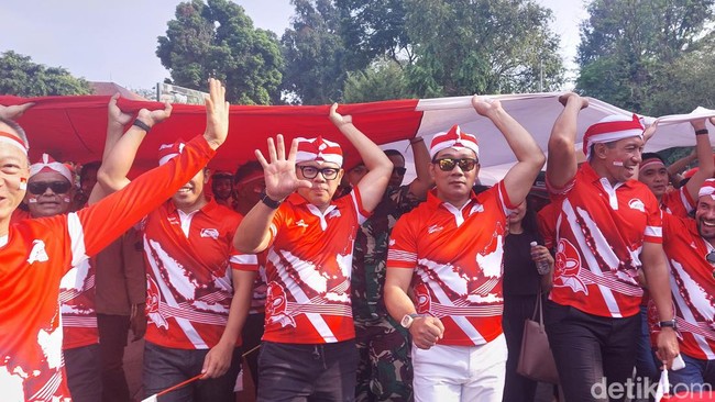 Ribuan orang turut serta mengibarkan bendera Merah Putih raksasa di Kota Bogor, Jawa Barat. Bendera sepanjang 100 meter itu diarak dari Balai Kota hingga Jl Surya Kencana, Kota Bogor.