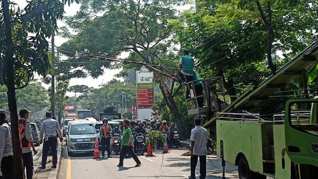 Pantauan detikcom di lokasi, Senin (14/8/2023), pukul 09.37 WIB, tampak petugas sedang berupaya mengevakuasi tiang yang hampir menutupi jalan itu.