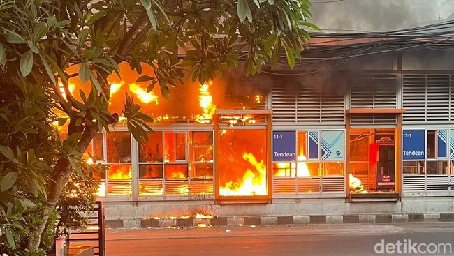 Pantauan detikcom, Senin (14/8/2023), api terlihat menyala di dalam halte tersebut. Belum diketahui penyebab kebakaran tersebut.