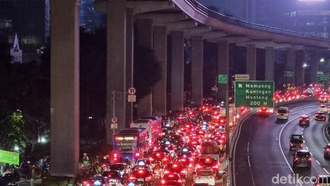 Pantauan detikcom, Senin (14/8/2023), pukul 18.55 WIB kemacetan panjang terjadi di Jalan Gatot Subroto mengarah ke Senayan. Kendaraan didominasi roda empat.
