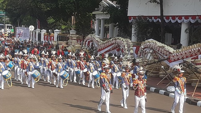 Ada juga pasukan drum band yang terlihat memasuki halaman Istana dari arah Monas. Di belakangnya ada pasukan berkuda dan petugas yang memakai baju adat.