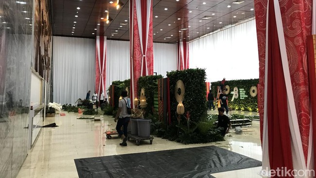 Selain itu, dekorasi di lobi memasuki ruang sidang paripurna juga masih belum rampung. Panitia masih mendekorasi bunga-bunga untuk dipasang di sekitar lobi.
