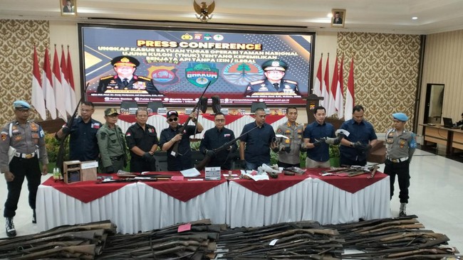 "Nah, enam orang yang kita tahan kemarin itu merupakan kepemilikan senpi hasil penggeladahan di rumah-rumah sekitar TNUK," kata Yudhis di Mapolda Banten, Senin (15/8/2023).