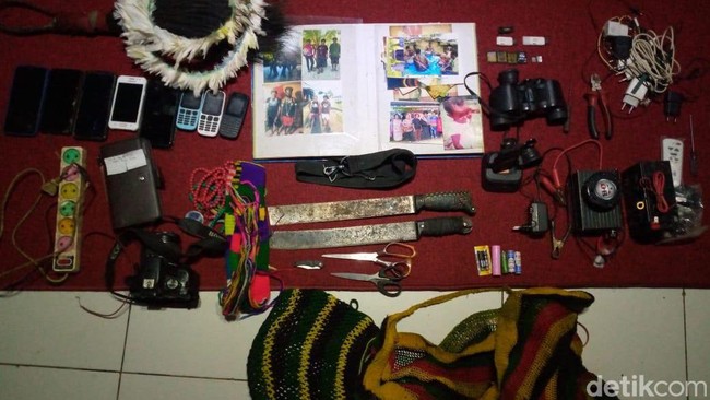 "Selain itu juga ditemukan alat-alat seperti parang, gunting, teropong, charger, serta memory card yang berisi foto dan video KKB," sebutnya.