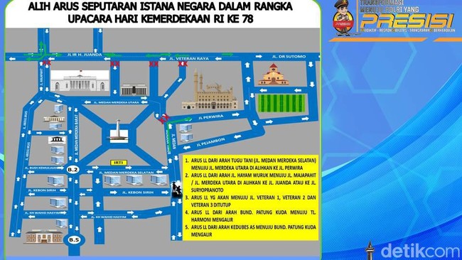 "Pengalihan arus seputaran Istana Negara dalam rangka upacara Hari Kemerdekaan RI ke-78," ujar Direktur Lalu Lintas Polda Metro Jaya Kombes Latif Usman, dalam keterangannya kepada detikcom, Rabu (16/7/2023).