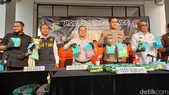 "Berhasil mengamankan atau menangkap dan mengamankan barang bukti sabu beserta ekstasi dan juga ganja untuk sabu-sabunya kurang lebih 25 kilogram untuk ekstasinya kurang lebih 4.000 butir, dan untuk ganjanya 3 kilogram. Untuk ganja sintetis kurang lebih 2 kilogram," ujar Kapolres Tangsel AKBP Faisal Febrianto dalam jumpa pers di kantornya, Rabu (16/7/2023).