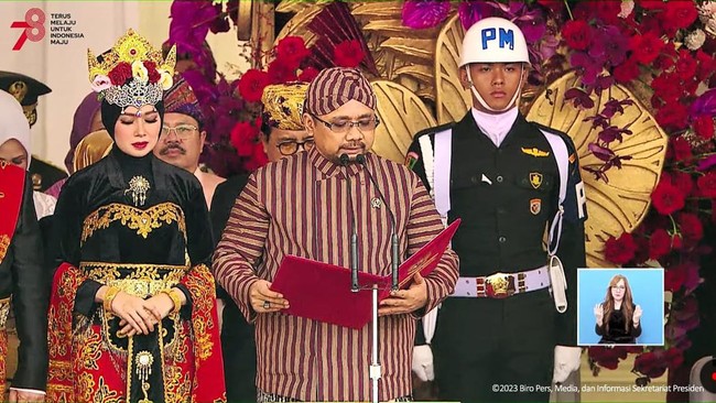 "Izinkan kami mensyukuri kemerdekaan yang engkau anugerahkan. Izinkan kami terus melaju untuk Indonesia Maju yang engkau tuntunkan," kata Yaqut di Istana Merdeka, Jakarta Pusat, Kamis (17/8/2023).