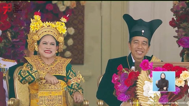 Pantauan detikcom di Istana Merdeka, Kamis (17/8/2023), Iriana tampak memakai baju dengan warna hijau dibalut hiasan emas. Tampak lengkap pula hiasan di kepala.
