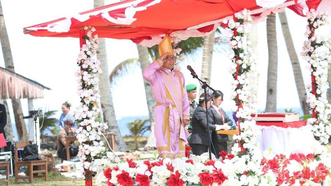 Menteri Desa Pembangunan Daerah Tertinggal, dan Transmigrasi (Mendes PDTT) Abdul Halim Iskandar memimpin upacara Hari Ulang Tahun (HUT) ke-78 Kemerdekaan Republik Indonesia (RI) di Miangas, Kabupaten Kepulauan Talaud, Sulawesi Utara, Kamis (17/8/2023). Gus Halim berbicara soal pentingnya kontribusi warga desa dalam mengisi kemerdekaan.
