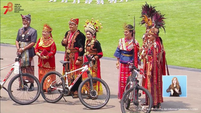 Perayaan Upacara HUT RI ke-78 juga dimeriahkan beragam penampilan para tamu undangan yang memakai baju adat unik. Keunikan busana adat yang dikenakan oleh Kaesang Pangarep dan Menkeu Sri Mulyani pun berbuah hadiah sepeda.