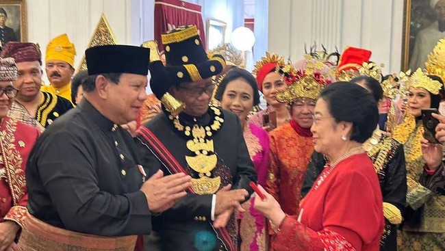 Para tokoh berkumpul di Istana Kepresidenan hari ini saat peringatan HUT ke-78 RI. Ada sebuah momen menarik saat Presiden ke-5 RI, Megawati Soekarnoputri, berjumpa dengan Menteri Pertahanan, Prabowo Subianto.
