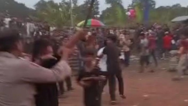 Video seorang pria mengacungkan golok ketika pertandingan sepakbola antar kampung (tarkam) di Desa Nameng, Rangkasbitung, Lebak, Banten, viral di media sosial. Pelaku disebut kabur setelah dilerai polisi.