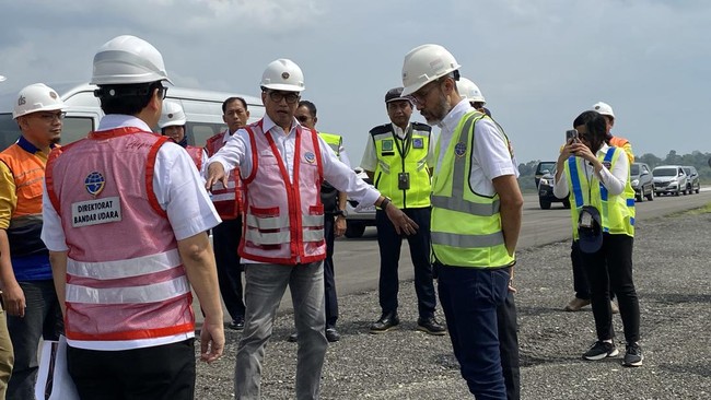 Pantauan detikcom di lokasi, Budi meninjau langsung bersama Direktur Bandar Udara Syamsu Rizal, dan Kepala UPBU APT Pranoto Samarinda Agung Pracayanto. Budi kemudian turun ke landasan bandara tersebut untuk mengecek kondisi tanah labil.