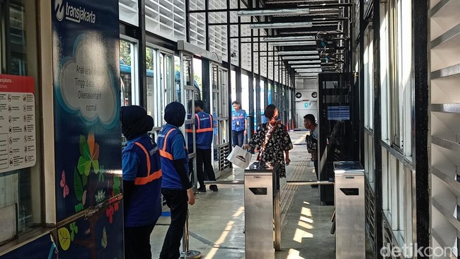 Pantauan detikcom di lokasi, Minggu (20/8/2023), petugas TransJakarta sudah bersiaga di area mesin tap in dan tap out kartu dan juga pintu-pintu halte. Namun, belum terpasang monitor di halte yang menunjukkan pergerakan bus TransJakarta.