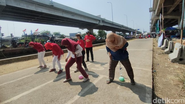 Pantauan detikcom di di RW 04, Kelurahan Cipinang Melayu, Kecamatan Makasar, Jakarta Timur, Minggu (20/8/2023), sejumlah emak-emak nampak mengantre menunggu gilirannya untuk lomba giring bola dengan botol. Perlombaan itu yakni warga membawa balon berisi air hingga sampai ke garis finish.