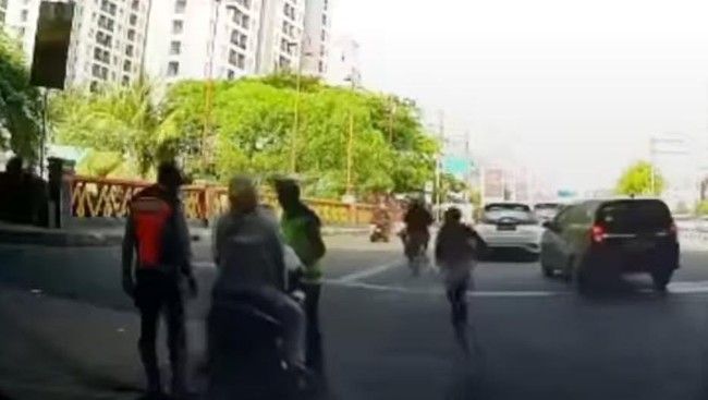 Awalnya, seorang polisi lalu lintas terlihat menyetop pengendara motor tersebut. Polisi tersebut kemudian meminta si pengendara motor untuk ke pinggir.