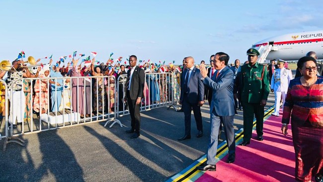 Presiden Joko Widodo (Jokowi) melakukan kunjungan kenegaraan ke Republik Persatuan Tanzania. Jokowi disambut tarian tradisional dari suku di Tanzania saat tiba di bandara.