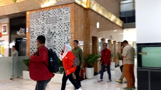 Putri Presiden ke-4 RI Abdurrahman Wahid (Gus Dur) itu tampak mengenakan jaket merah bertulisan 'Indonesia'. Yenny kemudian berpindah ruangan untuk bertemu dengan Menpora Dito Ariotedjo.