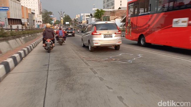 Di lokasi kejadian, nampak darah yang sudah mengering di Flyover Purwosari, Solo. Terlihat ada garis putih di sekitaran bekas darah tersebut.