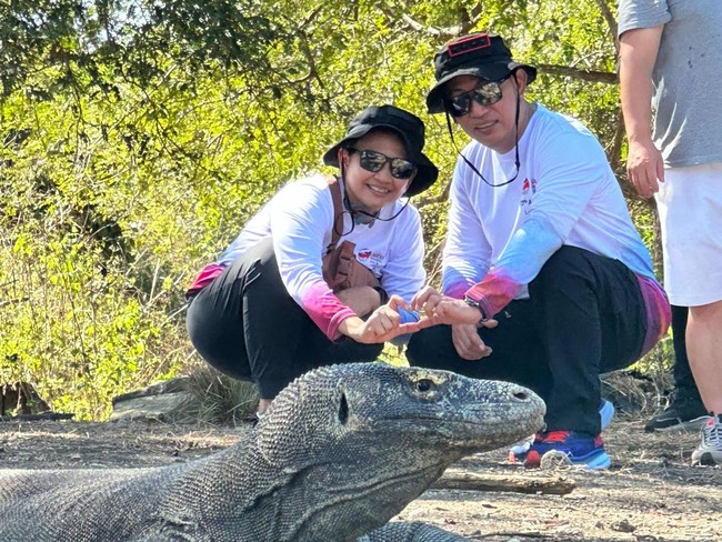 Pada kesempatan ini, para delegasi diberikan kesempatan untuk foto bersama dengan komodo. Kapolri dan istri tampak berpose gaya membentuk simbol cinta dengan jari di samping komodo. Kapolri dan istri tampak tersenyum melihat ke kamera.