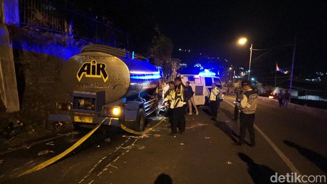 "Telah terjadi laka lantas rem blong. Di mana mobil tangki S 9085 UP ada muatannya, dari atas turun ke bawah remnya blong," kata Kapolsek Pacet AKP Amat.
