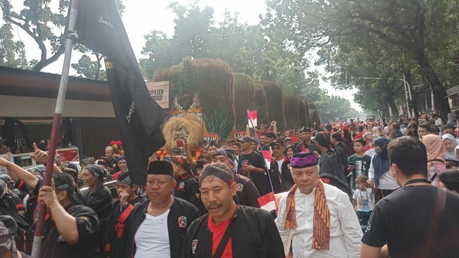 Rombongan dipimpin kesenian Reog Ponorogo. Ada yang mengenakan topeng besar berwajah harimau khas Reog Ponorogo. Turut ikut di belakangnya masyarakat Kabupaten Ponorogo.
