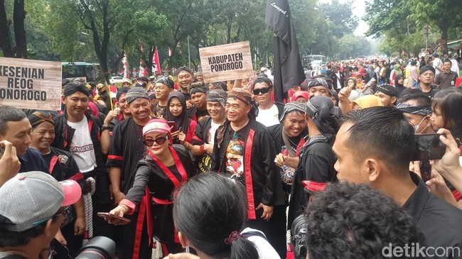 Pantauan detikcom di lokasi, Minggu (27/8/2023), rombongan pawai tiba di Kemenko PMK sekitar pukul 09.40 WIB. Mereka disambut langsung Muhadjir Effendy. Muhadjir terlihat mengenakan pakaian warok khas Ponoragan.