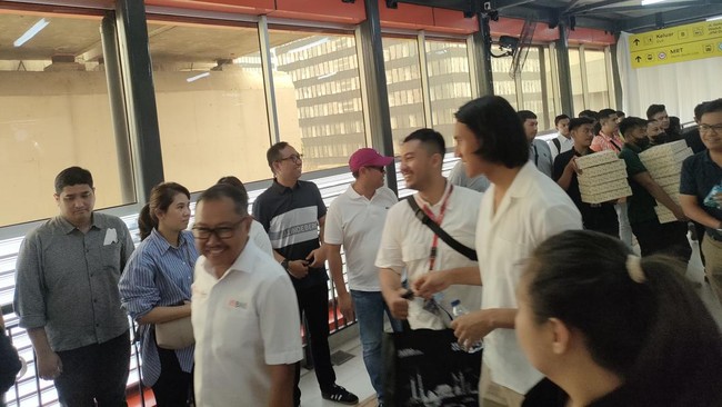 Kiky bersama suaminya, Muhammad Khairi, hingga Sean Gelael terlihat menjajal LRT sampai ke Dukuh Atas. Kedatangan mereka disambut meriah.