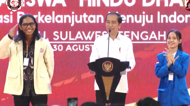 "Saya sudah muter di beberapa pertemuan tapi belum ada yang bisa menjawab. Silakan tunjuk jari dulu jangan maju. Nanti saya tunjuk baru maju. Yang di atas juga boleh maju, tapi jangan meloncat. Jauh di mata dekat di hati," kata Jokowi saat sesi tanya jawab berhadiah sepeda di Mahasabha XIII Kesatuan Mahasiswa Hindu Dharma Indonesia (KMHDI) di Universitas Tadulako, Palu, Sulawesi Tengah, Rabu (30/8/2023).
