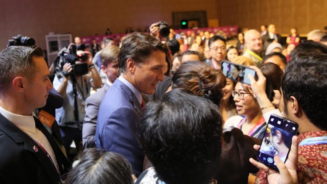 Usai memberikan pidato di ajang ASEAN-Indo Pacific Forum 2023, Perdana Menteri Kanada Justin Trudeau diserbu peserta yang memintanya berfoto selfie. Di ajang tersebut, Trudeau membahas kerja sama, kesejahteraan masyarakat, hingga perubahan iklim.