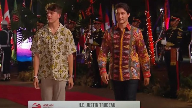 Perdana Menteri (PM) Kanada Justin Trudeau menghadiri Gala Dinner KTT ke-43 ASEAN di Hutan Kota GBK, Senayan, Jakarta. Justin datang didampingi putranya, Xavier Trudeau.