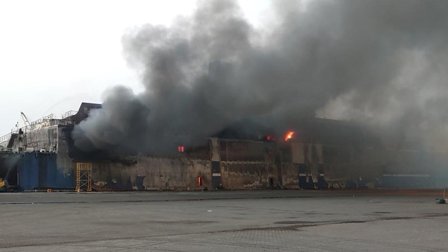 Kapal feri KMP Mutiara Berkah I terbakar di Pelabuhan Indah Kiat, Merak, Banten. Sopir truk yang menumpangi kapal itu menceritakan awal mula api muncul.