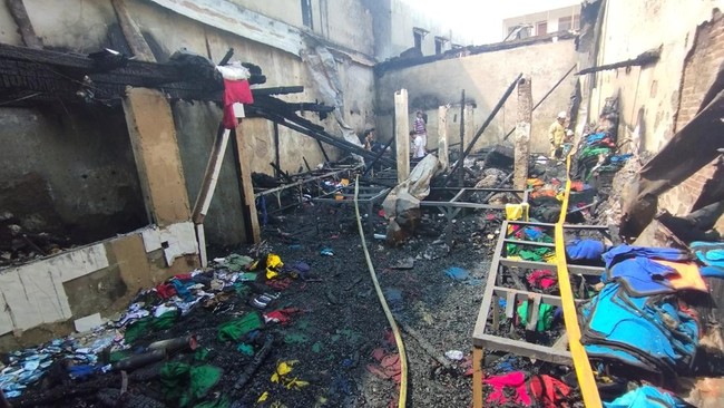 Sudah tidak ada lagi atap yang menutupi bangunan-bangunan tersebut. Material atap ambruk dan berserakan hangus dilalap si jago merah.