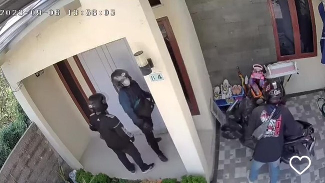 Dalam video yang dilihat detikcom, Jumat (8/9/2023), keempat maling itu tampak mengenakan helm. Salah satu di antaranya mencoba membuka pintu rumah.