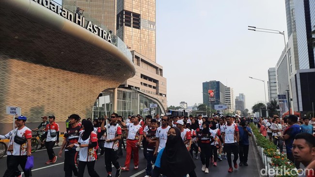 Hari bebas kendaraan bermotor (HBKB) atau car free day (CFD) di kawasan Jalan Sudirman-MH Thamrin, Jakarta, ramai pagi ini. Warga melakukan aktivitas mulai dari zumba hingga ada gerak jalan dari KONI DKI Jakarta.